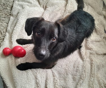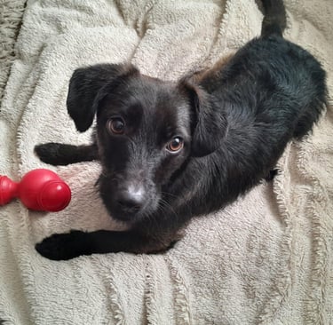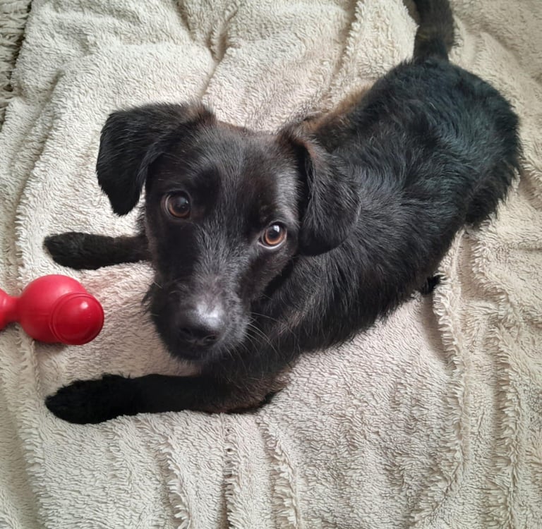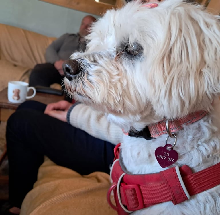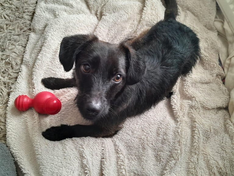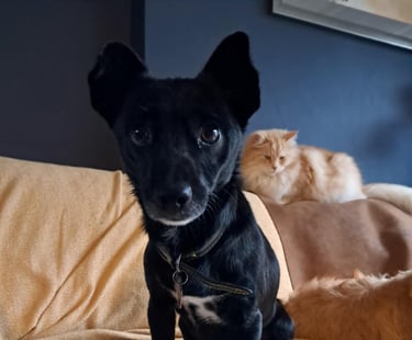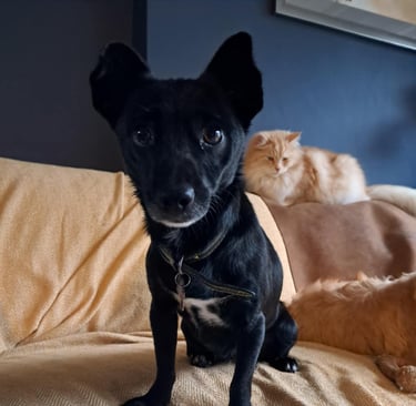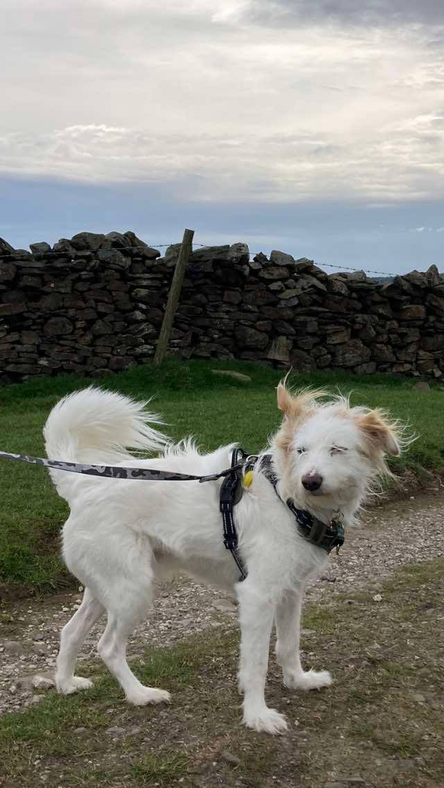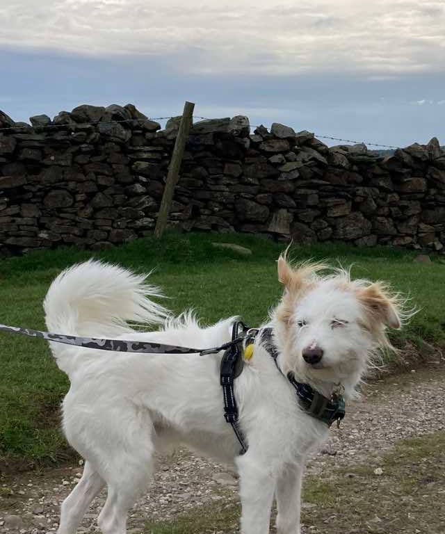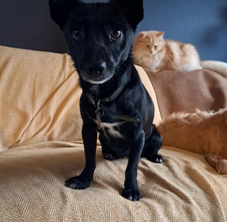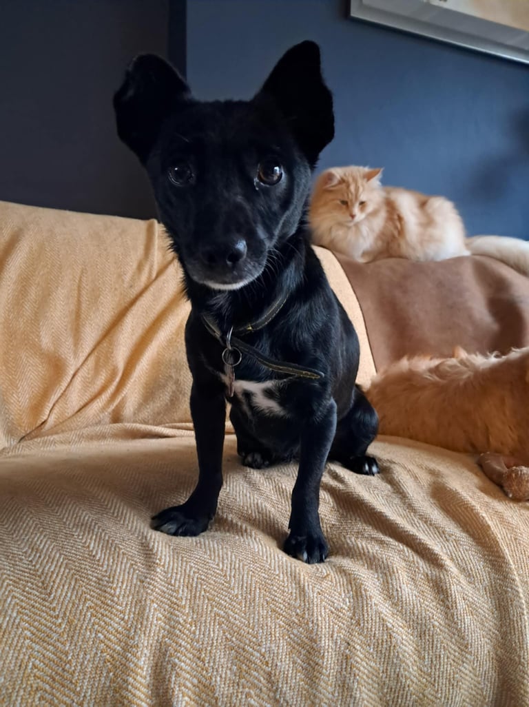 Tiny little Rumer now has dog & cat friends and goes for regular walks in the Lincolnshire wolds.